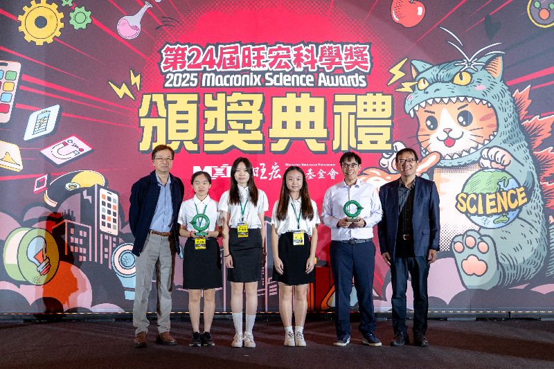臺灣大學生物化學暨分子生物學研究所詹迺立特聘教授(左一)頒發優等獎予臺北市立陽明高中吳欣庭、謝昕妍、廖于涵同學(左二、三、四)與林承恩老師(右二),蔡哲銘校長共享榮耀