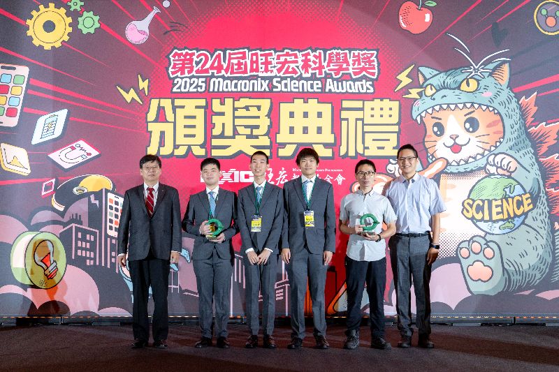 陽明交通大學林一平終身講座教授(左一)頒發銀牌獎予臺中一中黃柏文、洪鈞睿、楊佳泰同學(左二、三、四)與陳志峰老師(右二),陳彥綸設備組長共享榮耀