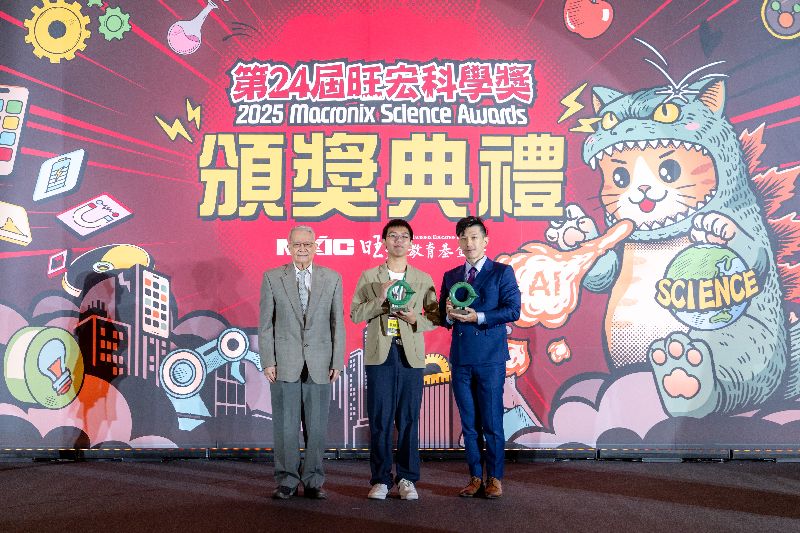 中央研究院劉兆漢院士(左)頒發銀牌獎予師大附中黃柏翔同學(中)與蕭煜修老師(右)
