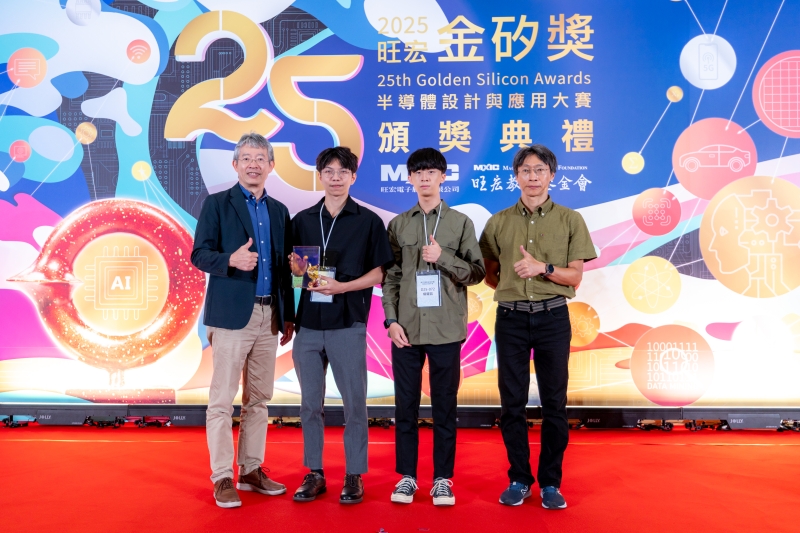 成功大學謝明得教授(左一)頒發設計組評審團銅獎予臺灣大學團隊,江介宏所長(右一)共享榮耀。
