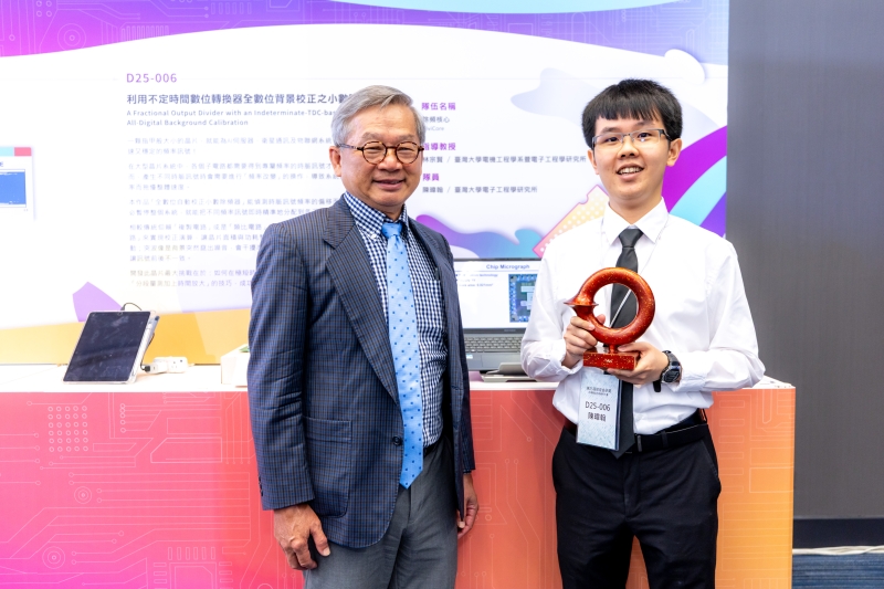 臺灣大學團隊作品「利用不定時間數位轉換器全數位背景校正之小數除頻器」指甲般大小的晶片,就能為AI伺服器、衛星通訊及物聯網系統,提供省電、快速穩定的頻率訊號。