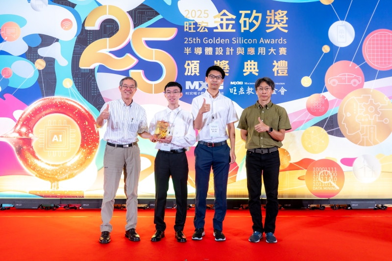 陽明交通大學蘇朝琴教授(左一)頒發設計組評審團銅獎予臺灣大學團隊,江介宏所長(右一)共享榮耀。