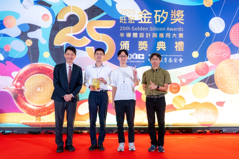 工研院張世杰所長(左一)頒發設計組評審團銅獎予臺灣大學團隊,江介宏所長(右一)共享榮耀。