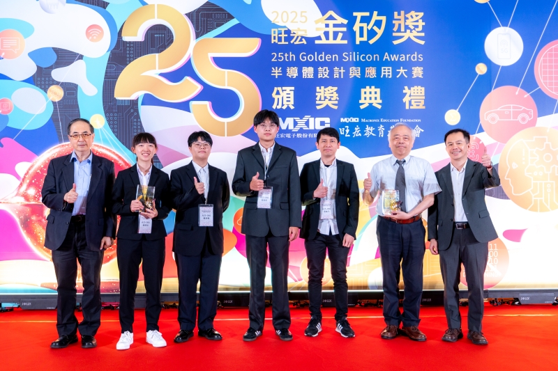 臺灣大學傅立成特聘教授(左一)頒發應用組評審團銅獎予清華大學團隊,徐碩鴻院長(右一)共享榮耀,