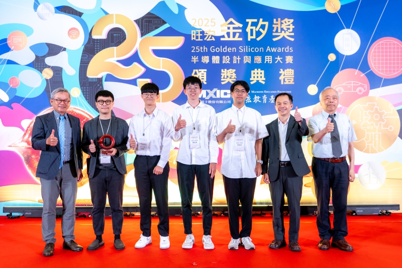 國科會吳誠文主委(左一)頒發應用組評審團金獎予清華大學團隊,徐碩鴻院長(右二)、白明憲副系主任(右一)共享榮耀,