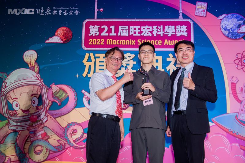 元智大學吳志揚教授(左一)頒發銀牌獎予臺南一中鄭丞恩同學(中),廖財固校長同享榮耀