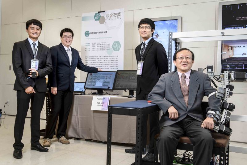 逢甲大學團隊以『智慧聯網六軸復建裝置』勇奪本屆應用組金獎及應用組新手獎雙項殊榮,與指導教授張興政、許煜亮開心合影