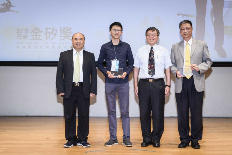 工業技術研究院資訊與通訊研究所吳文慶組長(左一)頒發設計組評審團銅獎予臺灣大學黃碩安同學,臺灣大學電機資訊學院陳銘憲院長(右二)及臺灣大學電子工程學研究所吳安宇所長(右一)上台同享榮耀
