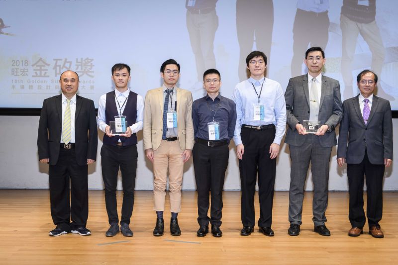 工業技術研究院資訊與通訊研究所吳文慶組長(左一)頒發設計組評審團銅獎予清華大學陳韋豪等同學,指導老師鄭桂忠(右二)及清華大學陳信文副校長(右一)上台同享榮耀