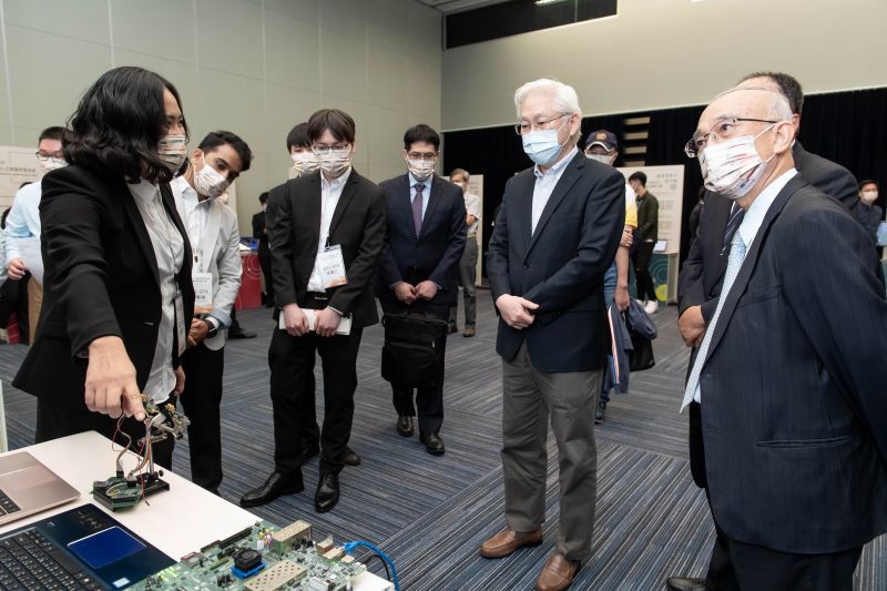 科技部吳政忠部長(右二)專心聆聽陽明交通大學大學團隊「適用於毫米波W頻段具高解析度與多用戶抗干擾之雷達系統」作品解說