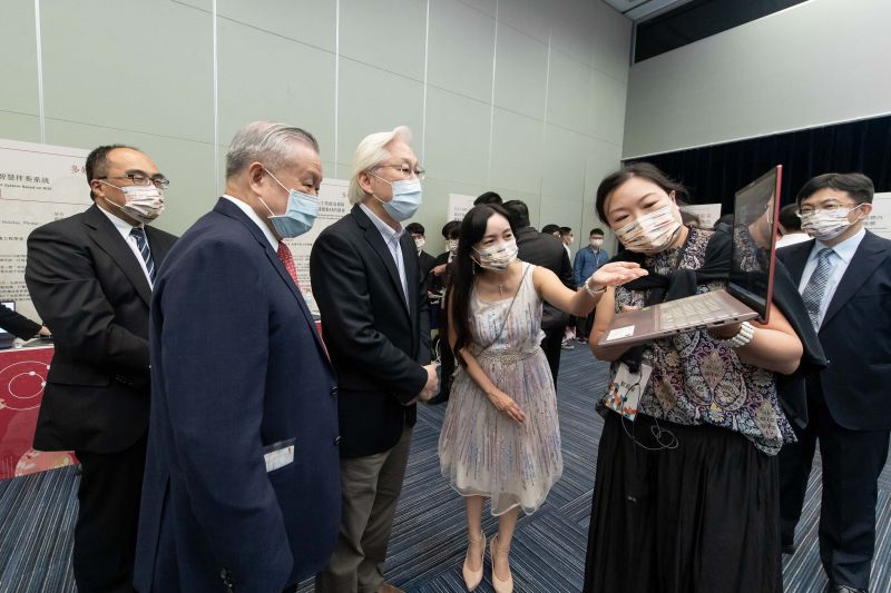 科技部吳政忠部長(左三)、旺宏教育基金會吳敏求董事長(左二)、經濟部工業局呂正華局長(左一)向因疫情無法到場、於線上觀禮的入圍學校校長致意