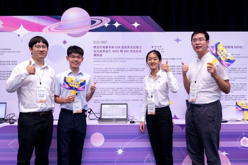 陽明交通大學團隊作品「應用於電動車與USB最新快充技術之氮化鎵單晶片400V轉48V直流直流轉換器」以氮化鎵當作晶片材料研究電流控制