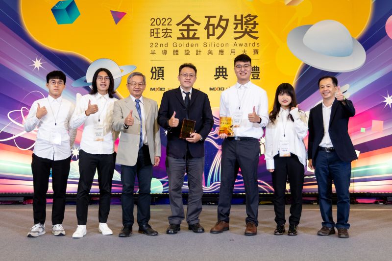 清華大學吳誠文特聘講座教授(左三)頒發設計組銅獎予清華大學團隊,徐碩鴻院長(右)上台共享榮耀