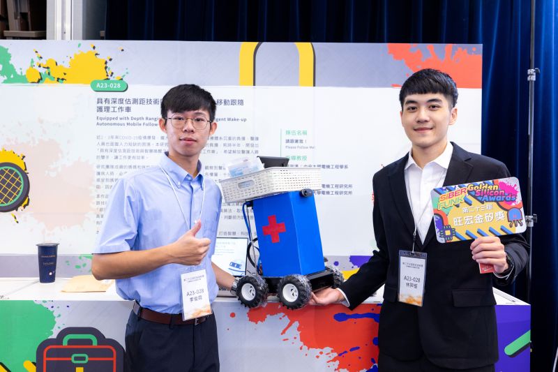 中央大學團隊作品「具有深度估測距技術與智慧喚醒之自主移動跟隨護理工作車」,利用智慧語音辨識、即時行人追蹤系統及深度估計神經網路技術,提升醫療照護人員的工作環境與效率