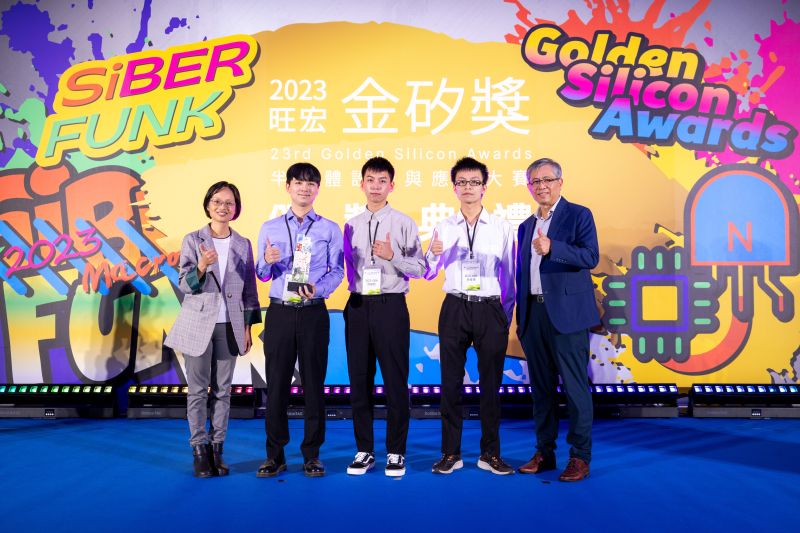 教育部終身教育司顏寶月副司長(左一)頒發設計組評審團銀獎予清華大學團隊,賴尚宏副院長(右一)共享榮耀