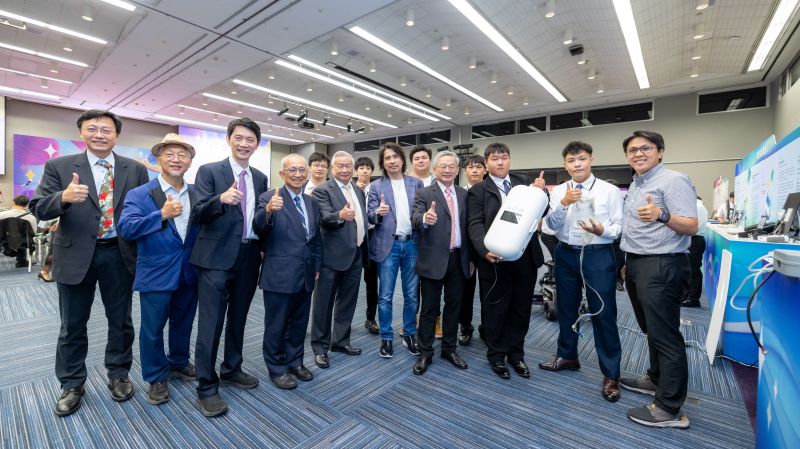 國科會吳誠文主委、教育部葉丙成次長及吳敏求董事長聆聽南臺科技大學團隊介紹「居家腹膜透析智能助理」作品。