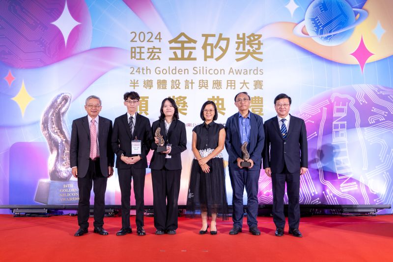 國科會吳誠文主委(左)頒發應用組評審團金獎予虎尾科技大學團隊,張信良校長(右)共享榮耀。