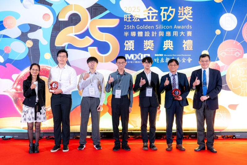 教育部終教司顏寶月副司長(左一)頒發應用組評審團銀獎予成功大學團隊,吳士駿院長(右一)共享榮耀。